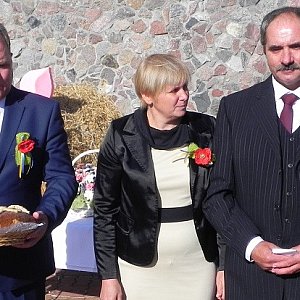 Starostowie dożynek Marian i Iwona Bembenkowie z Jaglic wręczyli burmistrzowi bochen chleba, ten częstował nim wszystkich obecnych, a dodatkowo sołtysowie otrzymali małe, poświęcone chlebki.